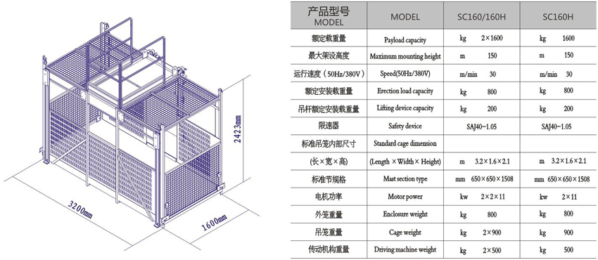 SC160/160H、SC160H系列施工升降機(jī) sc160/160H、SC160H系列施工升降機(jī)是我們公司新產(chǎn)品之一,它具有以下優(yōu)點: 1.無需專人籠內(nèi)操作。 2.全鍍鋅結(jié)構(gòu),結(jié)實耐用。 3.可選配自動平層方便運輸。 4.籠內(nèi)體積增大,結(jié)構(gòu)優(yōu)化,總重量減少,減少電機(jī)功耗節(jié)省電費。
